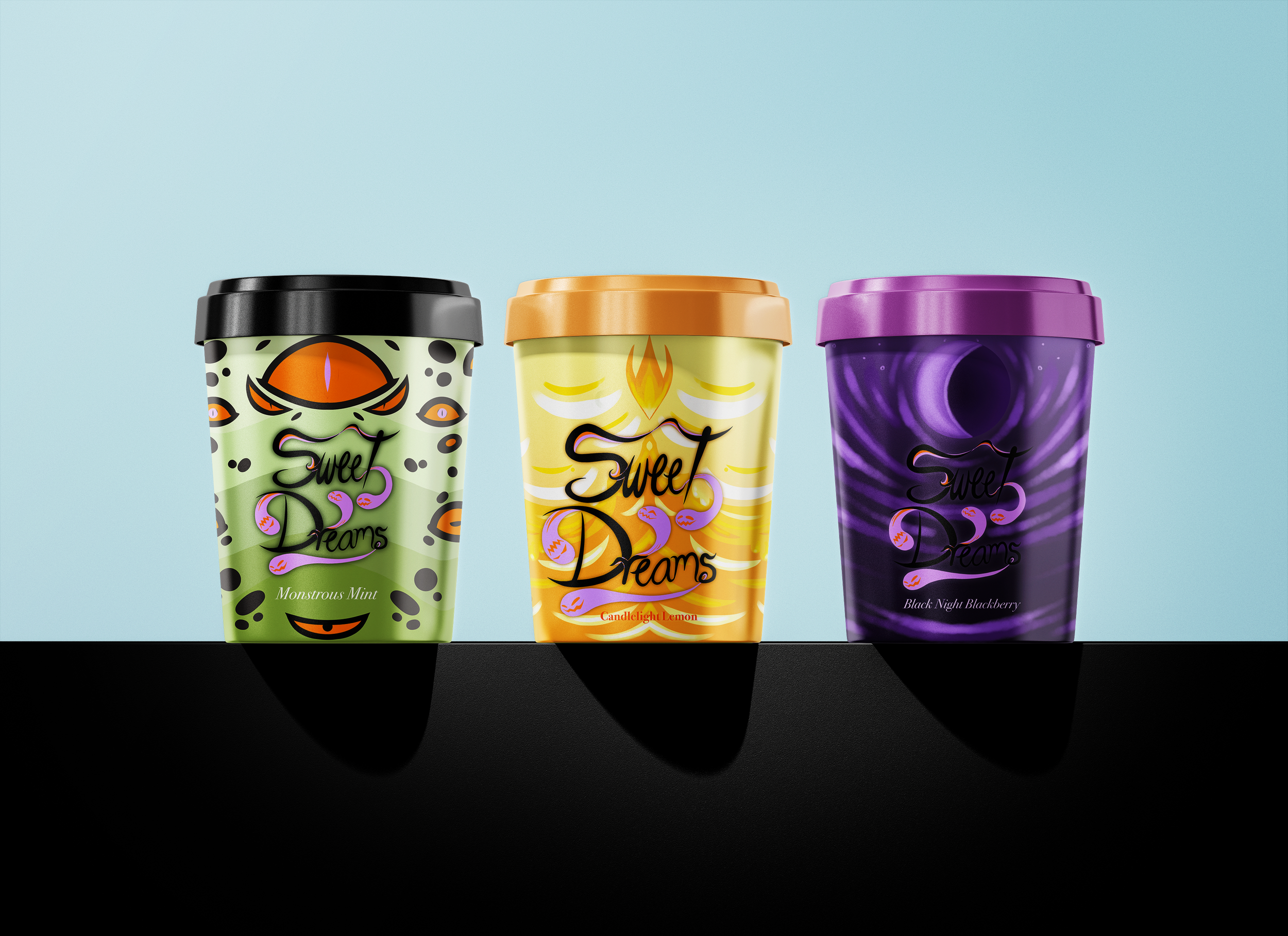 A small project showcasing an idea for an ice cream brand. Using the name of “Sweet Dreams,” I opted to create a Halloween themed line of flavors and container designs. The idea behind this was a concept of a brand that held the notion of “every day can be Halloween” with flavors and flavor names that aren’t seasonal only and available all-year round.