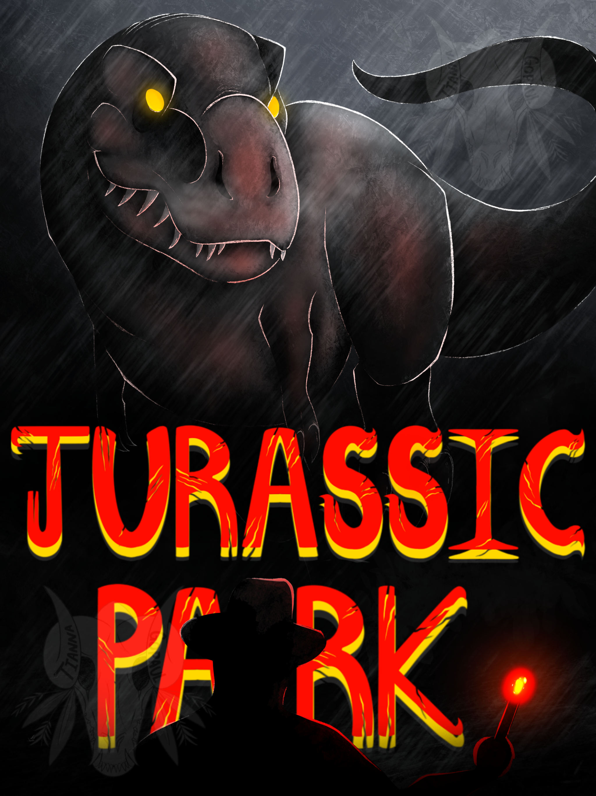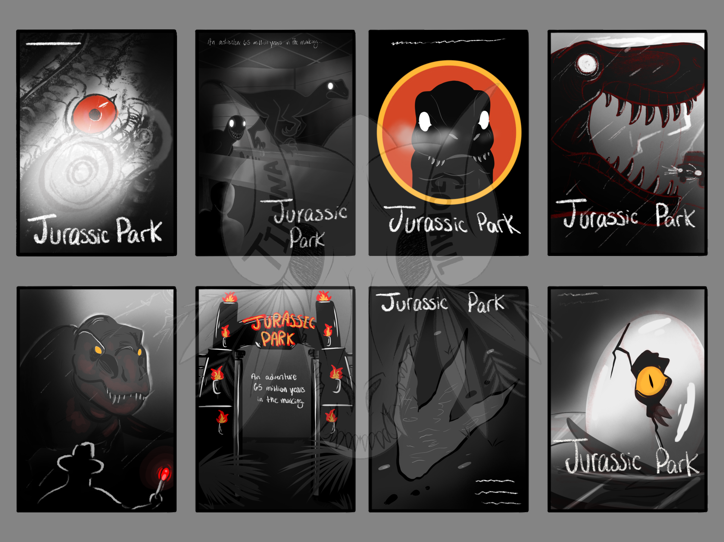 A fan-created poster, drawn by myself, for my own rendition of a Jurassic Park illustration to showcase on boards or in advertising. Below the illustrations are a show of my thumbnails and sketches of other ideas I had for this project, before I came up with the final image.
